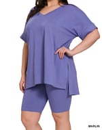 PLUS MICROFIBER V-NECK HI-LOW HEM TOP & BIKER SHORTS SET